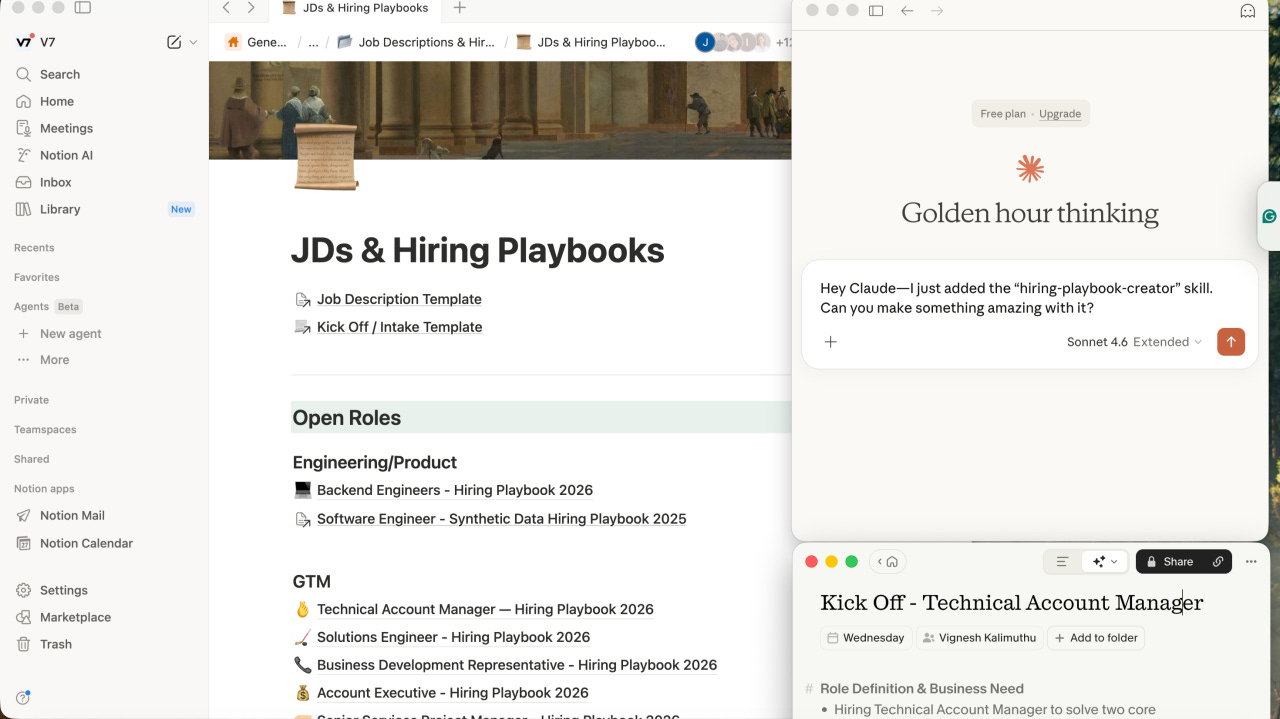 Un workflow simple pour Ă©viter de perdre des informations aprĂšs un intake meeting. LâidĂ©e: enregistrer la rĂ©union avec un notetaker, rĂ©cupĂ©rer le transcript, puis le faire analyser par une skill dans Claude. En quelques instants, lâIA transforme la conversation en hiring playbook structurĂ© dans Notion. Le document inclut une synthĂšse de lâintake, une job description formatĂ©e, un pitch du rĂŽle et une proposition de process dâentretien. Lâauteur explique aussi comment prĂ©parer lâintake en amont avec des donnĂ©es de recrutements passĂ©s, des profils de rĂ©fĂ©rence et du benchmarking salaire. Une fois la skill configurĂ©e, le mĂȘme workflow peut ĂȘtre rĂ©utilisĂ© pour chaque nouveau poste et produire une base de travail immĂ©diatement exploitable par le recruteur et le hiring manager.
